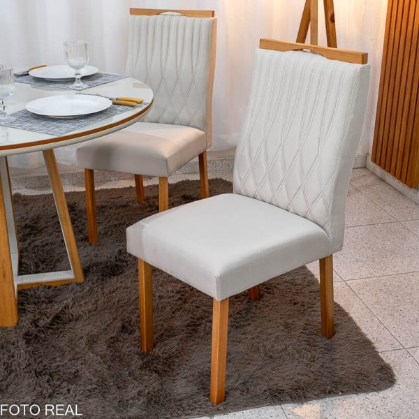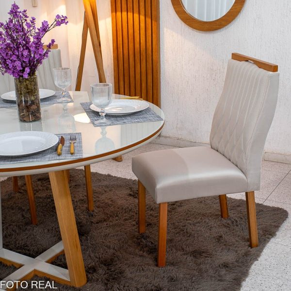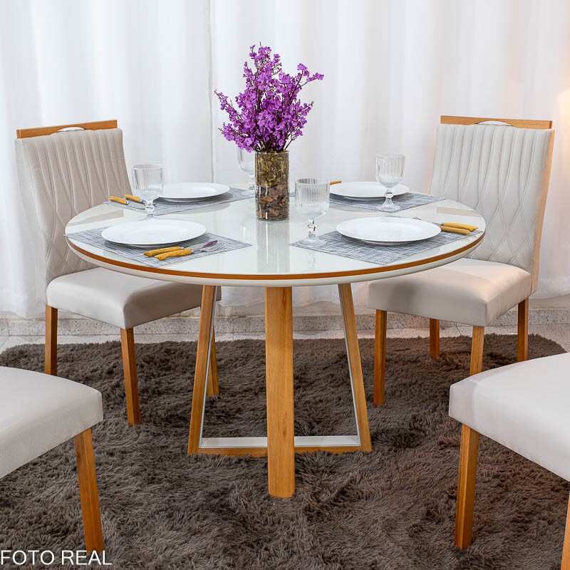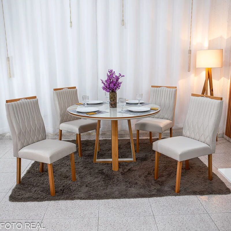 Mesa de Jantar Atlanta Redonda 120cm Vidro Off/Base Madeira Minas Plac + 4 Cad. Genova Veludo Bege 512 Madeira Art Assentos – Entregue Montada